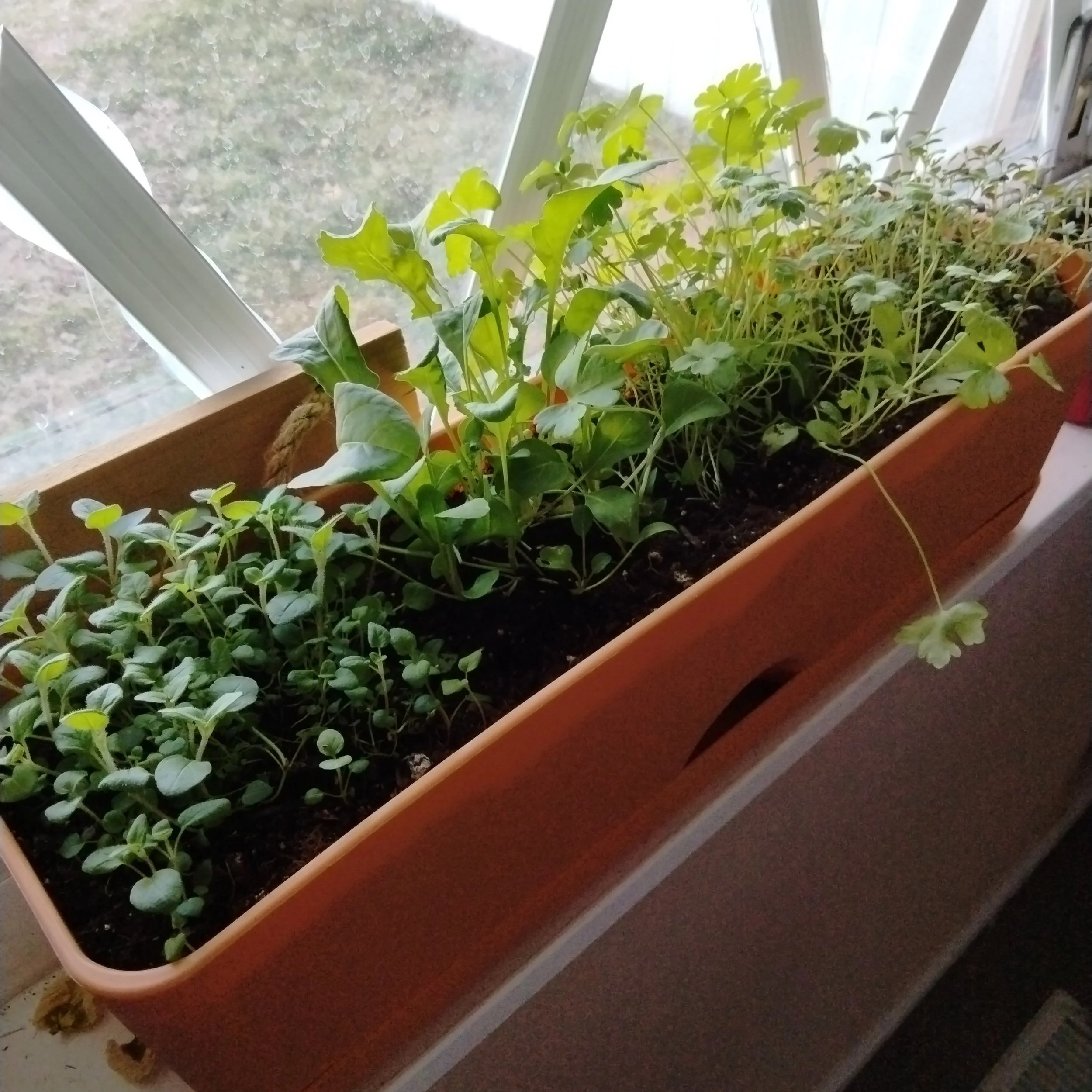 I like to use a long, thin, windowsill-shaped pot for growing herbs and greens in the kitchen. This one also has a hole in the bottom for watering the plants from the bottom up.
