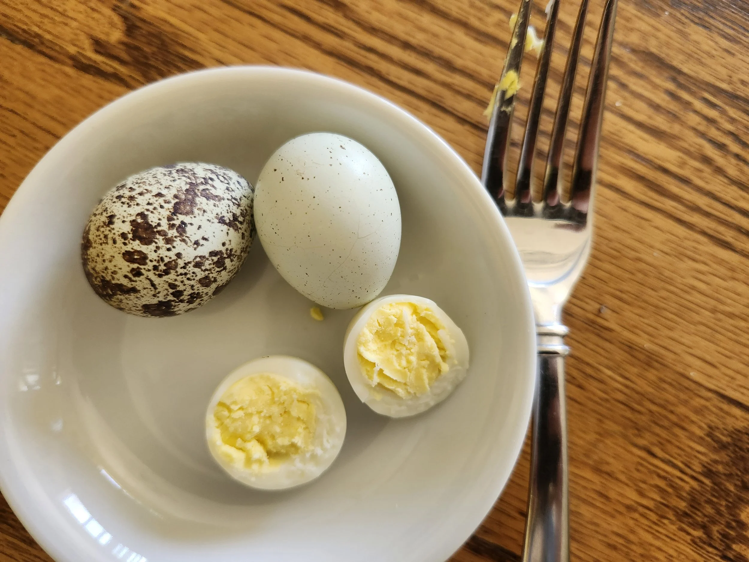 To boil a quail egg firm I like to get the water up to a steady boil, then I lower the eggs I’m cooking in on a slotted spoon. Boil them for 6 minutes steady, then scoop them back out and put them in a bowl of ice water. Usually I’m waiting to peel them til they’ve cooled all the way down. I’ve found the longer they cool in the fridge the easier the shell comes off. I like to drop a splash of white vinegar and a pinch of salt into the water to help the peel release a little easier, too.