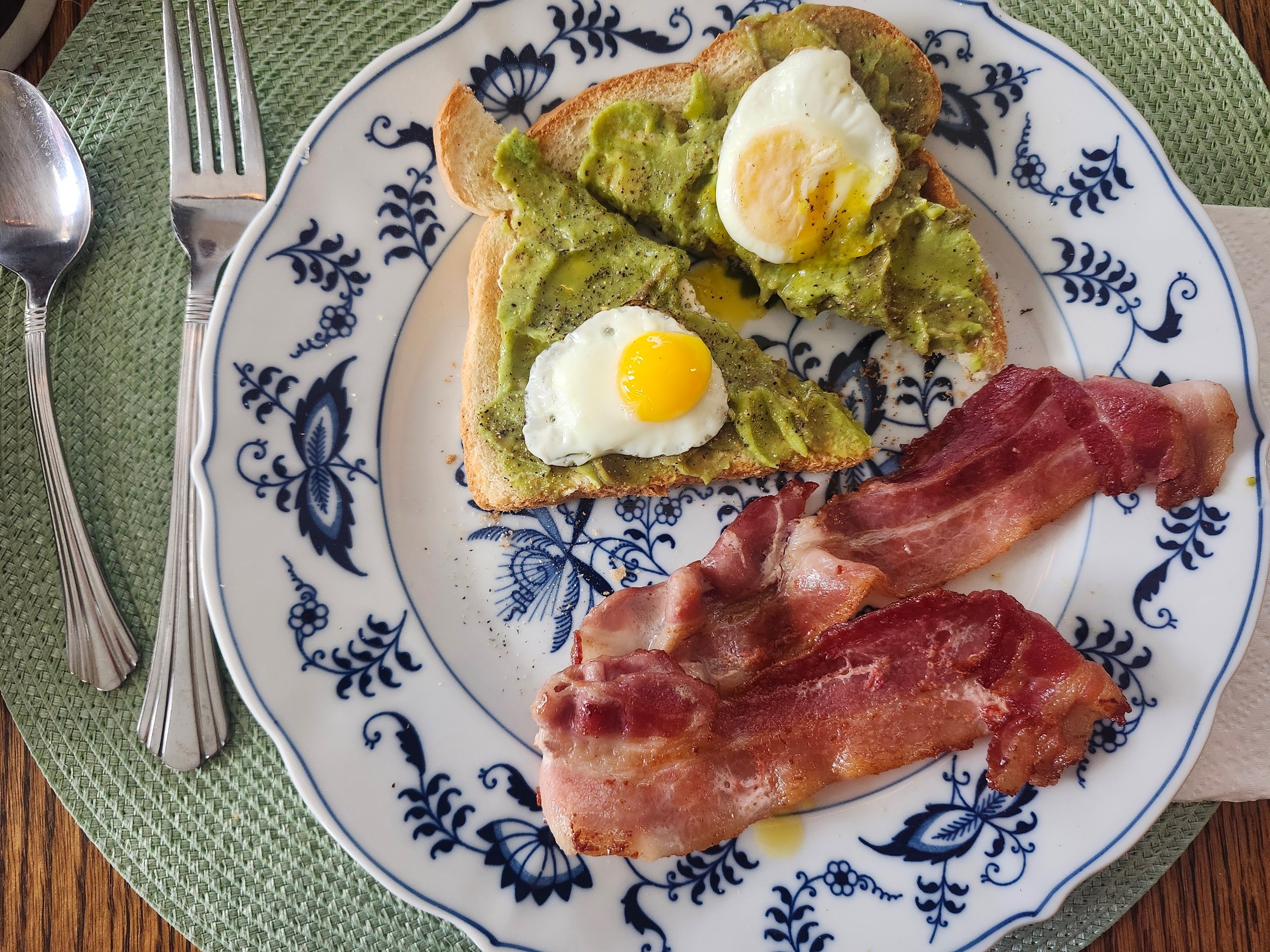 The easiest way to break a quail egg to fry is by cutting the top open and pouring it out in one drop. I prefer to use the little triangle scissors designed for the quail eggs specifically, but a pair of kitchen scissors got the job done alright. Once open, drop the egg directly in the hot pan and as the white gets that solid opacity top it with a lid for just long enough to warm the top of the yolk, too. Each egg took us less than five minutes on the pan, then we scooped them up with a spatula before settling them on top of the avocado on our toast. The avocado spread and the bite-size egg was a match made in heaven! Of course the side of bacon was a tasty addition, as well.