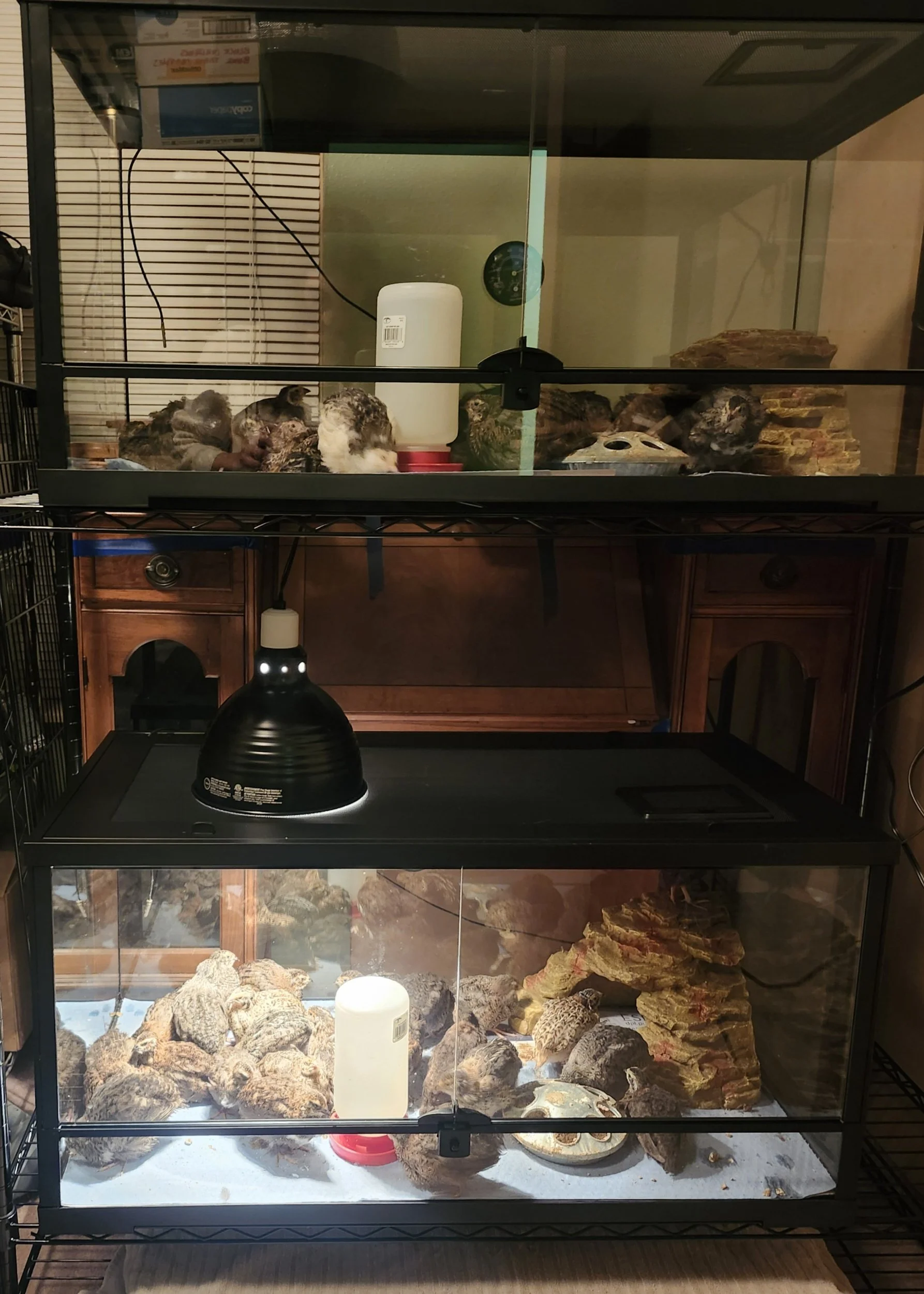 Using reptile tanks makes the brooding setup so much more efficient. It only takes half an hour or so a day to clean them, and with bigger feeders and water bottles they can be left to do their own thing for more time each day. I left the rock cave inside the tank and the quail love to hang out both on top and in the cave. The food dishes I kept around for offering treats and dust for bathing in. Even the heat lamps that came with the set were better for this setup than the ones at the farm stores. These tanks are made of glass, which makes them easily wipeable and disinfectable. They also feature front opening doors which means I don't have to worry so much about bumping heat lamps or scraping my arms up on the sharp edges of hardware cloth.